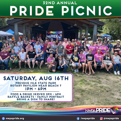 NW PA Pride Alliance will host the 32nd Annual Pride Picnic at the Rotary Pavilion on Presque Isle (near Beach 7) from 1 to 6 PM on Saturday, August 16.