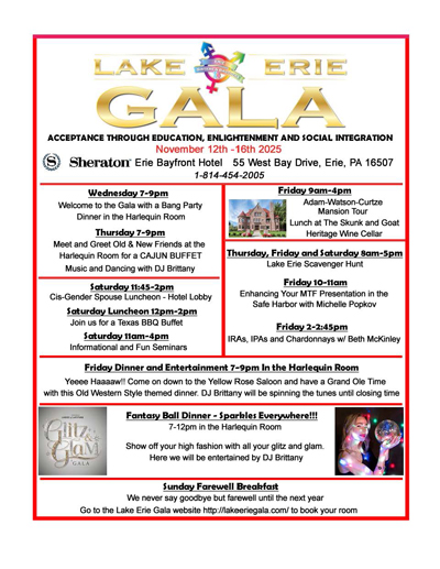 The Erie Sisters and Brothers 26th Annual Lake Erie Gala takes place November 12th through 16th at the Sheraton Erie Bayfront Hotel. The event attracts crossdressers, transgender people, their loved ones, and friends from throughout Erie, the surrounding cities, and even other states. The gala originated at the historic Riverside Inn in Cambridge Springs. However, in 1917, a kitchen fire broke out and engulfed the 132-year-old building in flames.