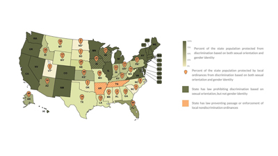 The number of LGBTQ+ inclusive municipal ordinances continues to grow - with efforts in various states, including Kansas, which does not have a statewide ban on LGBTQ+ discrimination but has the highest percentage of its LGBTQ+ population covered by these kinds of local ordinances instead. Approximately half of the state's queer community is protected by local laws.