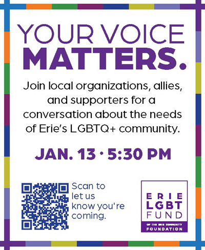 To continue the conversation and hear from even more organizations and individuals involved in the LGBTQ+ community, the LGBT Fund is planning a gathering Tuesday, January 13, 2026, 5:30 to 7:00 p.m. in the Barn Boardroom of The Erie Community Foundation. The board of the fund invites all interested individuals to take part in the gathering.