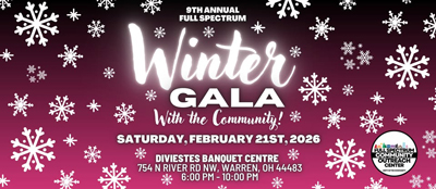Feb 21 (Sat) - 9th Annual Full Spectrum Winter Gala (DiVieste's Banquet Centre, 754 N River Rd NW, Warren, OH 44483) 6 PM - 10 PM. Hosted by Denise Russell. Special Guest Performances by: Coming Soon! Tickets include the following: Full Show, Dinner Buffet, Open Bar, Dancing, Door Prize Tickets, and Swag Bags. Raffle Baskets, 50/50 Raffle Phone: (234) 254-8924. Venue Phone: (330) 847-7422. Email: info@fullspectrumcommunityoutreach.org. Browse to https://www.fullspectrumcommunityoutreach.org/. RSVP/Register/Tickets at https://www.facebook.com/events/9886745021423421. Browse to venue web site http://diviestebanquet.com/.