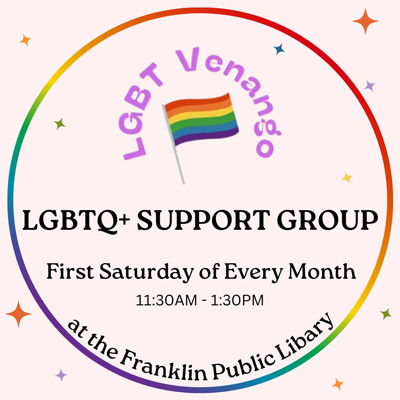 Mar 7 (Sat) - LGBT Venango Support Group meets (Franklin Public Library, 421 12th St, Franklin, PA 16323) 11:30 AM. Peer-led support group for LGBTQ+ adults. We meet once a month upstairs at the Franklin Library. Venue Phone: (814) 432-5062. Browse to https://lgbtvenango.com/. Browse to venue web site https://oilregionlibraries.org/locations/franklin-public-library/.