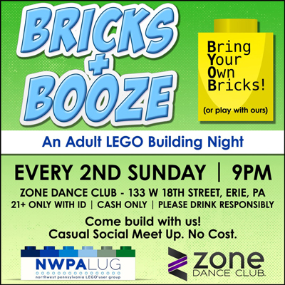 Mar 8 (Sun) - Bricks & Booze: An Adult LEGO Building Night (Zone Dance Club, 133 W 18th St, Erie, PA 16501) 9 PM. Join our friends from the Northwest Pennsylvania LEGO User Group (NWPALUG) for a casual, creative night here at The Zone. Bring the cool sets you just bought, show off your finds, and just relax with other adult builders. You can bring your own bricks or just come and play with ours! This is a 21+ only night, please bring your ID. No cover charge to build and hang out! The bar is cash only. Browse to https://thezonedanceclub.com/.