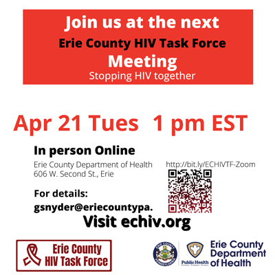 Apr 21 (Tue) - Erie County HIV Task Force meets (Hybrid) (Erie County Department of Health (ECDH), 606 W 2nd St, Erie, PA 16507) 1 PM. The Erie County HIV Task Force is a collaboration of local organizations and individuals dedicated to educating, supporting, and advocating for people living with HIV/AIDS and preventing the spread of infection. Zoom Meeting ID: 927 9128 9996. Passcode: 940728 Join Zoom Meeting https://zoom.us/j/92791289996?pwd=UVlySWxGV1N1YmRmdjRKcExXVEQrQT09 Contact: Gary Snyder. Phone: (814) 451-6700. Venue Phone: (814) 451-6700. Browse to https://echiv.org/. Browse to venue web site https://eriecountypa.gov/departments/health/.
