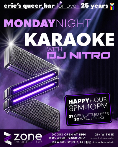 Apr 6 (Mon) - Zone Monday Night Karaoke With DJ Nitro (Zone Dance Club, 133 W 18th St, Erie, PA 16501) 9 PM - 12 AM. Doors open at 8 PM. No cover. Cash only. Happy hour 8 PM - 10 PM. $1 off bottled beer, $2 well drinks. 21 and over with ID. Please drink responsibly. Browse to https://thezonedanceclub.com/.