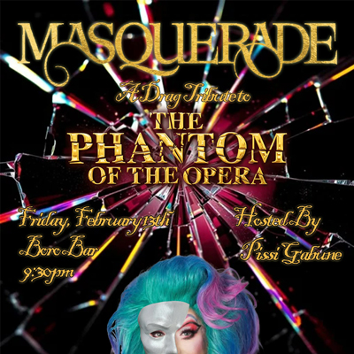 Feb 13 (Fri) - Masquerade: A Drag Tribute to Phantom of the Opera (Boro Bar, Erie, PA 16412) 9:30 PM. Hosted by Pissi Gabune. Contact: Pissi Gabune (Austin Kulyk). Phone: (814) 734-1463.