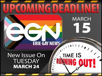 Mar 15 (Sun) - Deadline for Erie Gay News April 2026 print edition (#365) (Erie Gay News, 1115 W 7th St, Erie, PA 16502-1105) Please have all articles, ads, and submissions in by this date. This issue will be released on the evening of Tuesday, March 24. For a complete list of upcoming deadlines and release dates, check the print edition schedule at www.eriegaynews.com/printedition/deadlineschedule.php Contact: Michael Mahler. Phone: (814) 456-9833. Email: info@eriegaynews.com. Browse to https://www.eriegaynews.com.