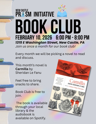 Feb 10 (Tue) - Book Club (Third Independent Presbyterian Church, 1315 E Washington St, New Castle, PA 16101) 6 PM - 8 PM. Join Us for Book Club! Come be part of our monthly book club held on the second Tuesday of every month at The New Castle Prism Initiative! Each month, we'll dive into a new novel to read and discuss together. This month's pick: Carmilla by Sheridan Le Fanu. Bring your thoughts, your favorite snacks to share, and an open mind! Book Club is free and open to everyone. Venue Phone: (724) 698-5753. Email: ncprism123@gmail.com. Browse to https://newcastlepride.org/. RSVP/Register/Tickets at https://www.facebook.com/events/1543911040150808/. Browse to venue web site https://www.facebook.com/TIPChurch.