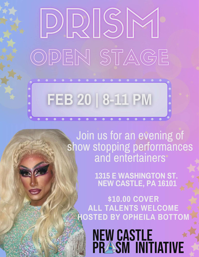 Feb 20 (Fri) - Prism Open Stage (Third Independent Presbyterian Church, 1315 E Washington St, New Castle, PA 16101) 8 PM - 11 PM. Presented by The New Castle Prism Initiative. Get ready for an unforgettable night of creativity, confidence, and community! Join us for Prism Open Stage, an inclusive evening celebrating bold talent, fierce performances, and queer joy. $10 Cover. All talents welcome! Whether you sing, dance, lip sync, read poetry, perform drag, or cheer from the crowd this stage is for YOU. Hosted by the fabulous Opheila Bottom. Interested in performing? Please message us or email us directly at ncprism123@gmail.com to sign up in advance. Depending on how busy the night is, walk-in performers will also be accepted. Come support local artists, uplift queer voices, and help strengthen LGBTQIA+ programming right here in our community. Bring a friend. Take the stage. All proceeds support The New Castle Prism Initiative. Venue Phone: (724) 698-5753. Email: ncprism123@gmail.com. Browse to https://newcastlepride.org/. RSVP/Register/Tickets at https://www.facebook.com/events/1318671266686580/. Browse to venue web site https://www.facebook.com/TIPChurch.