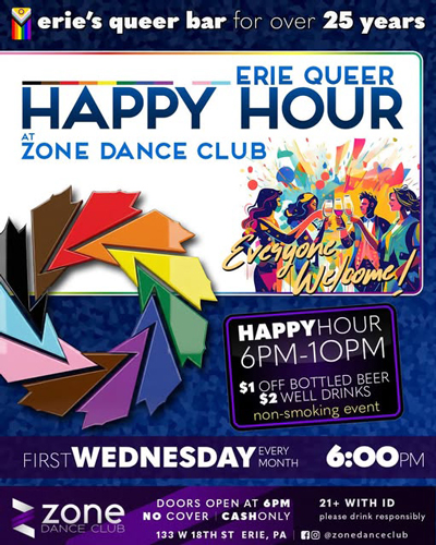 Mar 4 (Wed) - Erie Queer Happy Hour (Zone Dance Club, 133 W 18th St, Erie, PA 16501) 6 PM - 8 PM. Happy Hour 6PM - 10PM. $1 off bottled beer, $2 well drinks. Non-smoking event. Doors open at 6 PM. No cover charge. Cash only. 21+ with ID. Please drink responsibly. Phone: (814) 314-9075. Browse to https://www.nwpapride.org. Browse to venue web site https://thezonedanceclub.com/.