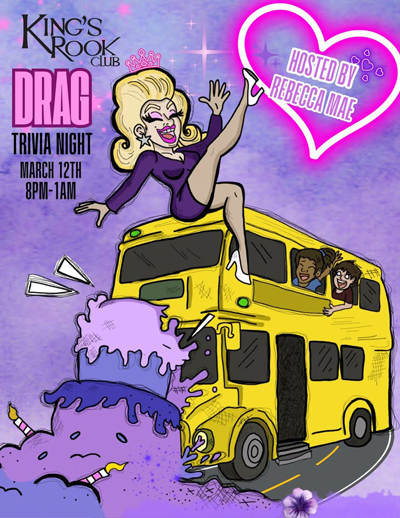 Mar 12 (Thu) - Trivia Drag Night! Hosted By Rebecca Mae (King's Rook Club, 1921 Peach St, Erie, PA 16502) 8 PM. Don't Be a Drag, Just Be a Winner! We are honored to have Rebecca Mae in the Club for a Drag themed Trivia special! compete and test your knowledge to determine who's the smartest queen at the King's Rook Club. 1st Prize: $25.00 + 1 drink ticket 2nd Prize: 3 drink tickets. Doors open at 8pm, Trivia at 9:30PM. Food: Roc's Catering Sound: Terry Crebel. Members Free before 11pm $5.00 after that. Non members $10.00. Vending by From the ashes Promotions. THIS EVENT IS FOR MEMBERS AND GUESTS. ALL GUESTS MUST BE SIGNED IN! KINGS ROOK CLUB IS A 21+ VENUE Phone: (814) 456-6439. Browse to https://www.facebook.com/kingsrookclub/. RSVP/Register/Tickets at https://www.facebook.com/events/1163023799308233.
