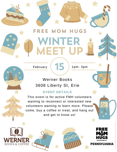 Feb 15 (Sun) - Free Mom Hugs Erie Winter Meet Up (Werner Books & Coffee, Erie, PA 16508) 1 PM - 3 PM. Come and connect with current Free Mom Hugs Erie leaders and volunteers. If you’re interested in becoming a new volunteer, please come by and hang out! Buy a beverage or treat and get to know us! Phone: (814) 460-0722. Venue Phone: (814) 864-1565. Browse to https://www.facebook.com/groups/2327910157296581. RSVP/Register/Tickets at https://www.facebook.com/events/25480428064992574. Browse to venue web site http://www.wernerbooks.com/.