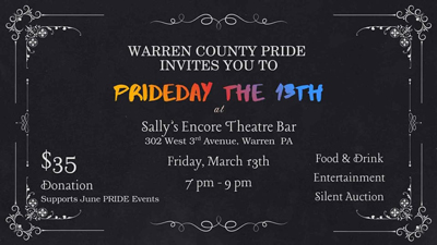 Mar 13 (Fri) - PrideDay the 13th - Benefitting Warren County Pride Fundraiser (Struthers Library Theatre - Sally's Encore Theatre Bar, Warren, PA 16365) 7 PM. Come dressed in black and celebrate superstitions while supporting Warren County Pride! Bid on exciting auction items and enjoy top notch food and entertainment. Proceeds benefit our 2026 Pride Festival. $35 donation supports June Pride events. Venue Phone: (814) 723-7231. Email: warrencountypride@gmail.com. Browse to https://www.facebook.com/WarrenCountyPride. RSVP/Register/Tickets at https://www.facebook.com/events/2137883797041528. Browse to venue web site https://www.strutherslibrarytheatre.org/.
