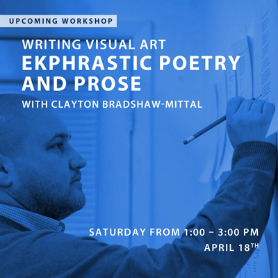 Apr 18 (Sat) - Writing Visual Art: Ekphrastic Poetry and Prose (Erie Art Museum, 20 E 5th St, Erie, PA 16507) 1 PM. This 1-session workshop explores ekphrastic writing, where participants create poetry or prose inspired by visual art. Using examples from John Keats, Gertrude Stein, W.H. Auden, and others, students will engage in a generative exercise to write an ekphrastic piece about a work of art in the museum, followed by feedback and discussion. This workshop is included with Museum admission. We also ask that participants mark their attendance with donations which will go directly to Compton's Table, a local nonprofit in Erie, PA. Participants bring their own writing supplies; pencils and paper provided Phone: (814) 459-5477. Browse to http://www.erieartmuseum.org. RSVP/Register/Tickets at https://www.erieartmuseum.org/ekphrastic-poetry.