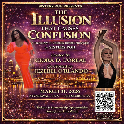 Mar 31 (Tue) - The Illusion That Causes Confusion: Trans Day of Visibility Drag Showcase (Stonewall Inn PGH, 211 Smithfield St, Pittsburgh, PA 15222) 5 PM. "The Illusion That Causes Confusion" brings together an incredible lineup of artists for a night of performance, celebration, and community. This showcase will uplift trans artistry while raising support for the continued work of Sisters PGH and the Stonewall Inn Pittsburgh. The evening will be hosted by Ciora L. L'Oreal and Jezebel Bebbington D'opulence. Featured performers include:Vivyan Mourningwould, Mercedez L. L'Oreal , Jezebel Diamond ST Klair, Alexis Santee, and Kierra Darshell. Proceeds from the showcase will go directly toward supporting the programs and services of Sisters PGH and the continued development of the Stonewall Inn Pittsburgh.Tickets are available now, and capacity is limited. Phone: (412) 636-7613. Email: ciora.thomas@sisterspgh.org. Browse to https://www.facebook.com/sistersPGH/. RSVP/Register/Tickets at https://givebutter.com/xfW6ee.