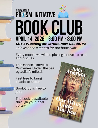 Apr 14 (Tue) - New Castle Prism Initiative Book Club: Our Wives Under the Sea (Third Independent Presbyterian Church, 1315 E Washington St, New Castle, PA 16101) 6 PM - 8 PM. Each month, we'll dive into a new novel to read and discuss together. This month's pick: Our Wives Under the Sea by Julia Armfield. Bring your thoughts, your favorite snacks to share, and an open mind! Book Club is free and open to everyone. Synopsis: Leah is changed. A marine biologist, she left for a routine expedition months earlier, only this time her submarine sank to the sea floor. When she finally surfaces and returns home, her wife Miri knows that something is wrong. Barely eating and lost in her thoughts, Leah rotates between rooms in their apartment, running the taps morning and night. Whatever happened in that vessel, whatever it was they were supposed to be studying before they were stranded, Leah has carried part of it with her, onto dry land and into their home. As Miri searches for answers, desperate to understand what happened below the water, she must face the possibility that the woman she loves is slipping from her grasp. By turns elegiac and furious, wry and heartbreaking, Our Wives Under the Sea is an exploration of the unknowable depths within each of us, and the love that compels us nevertheless toward one another. Book Club is done in partnership with the New Castle Public Library. You can access the book through the library. Venue Phone: (724) 698-5753. Email: ncprism123@gmail.com. Browse to https://newcastlepride.org/. RSVP/Register/Tickets at https://www.facebook.com/events/835823542855823. Browse to venue web site https://www.facebook.com/TIPChurch.