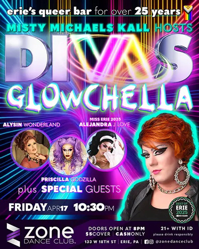 Apr 17 (Fri) - Zone Divas: Glowchella (Zone Dance Club, Erie, PA 16501) 10:30 PM. Hosted by Misty Michaels Kall. ick off Glowchella weekend with a spectacular neon edition of DIVAS! Hosted by Misty Michaels Kall, this glowing drag showcase features dazzling performances by Alysin Wonderland, Priscilla Godzilla, Miss Erie 2025 Alejandra J Love, and special guests. Email: info@thezonedanceclub.com. Browse to https://thezonedanceclub.com/.
